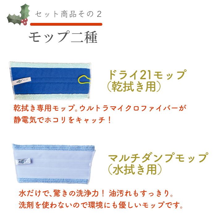 乾拭き用と水拭き用のモップ、さらに窓拭き用クロスが入っているので、